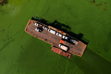top down view of ferryboat. Ferryboat transferring cars. Ferry transfers cars and passengers to the other side