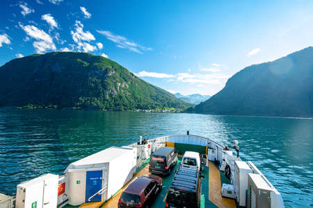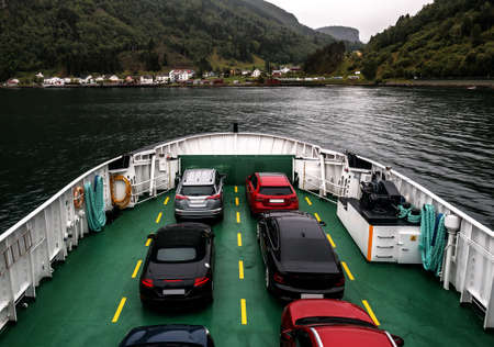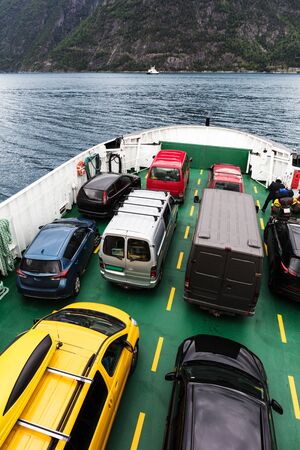 Big and small vehicles are arranged on a ferry ship to cross a fjord Sognefjord from Mannheller to Fodnes, Norway.