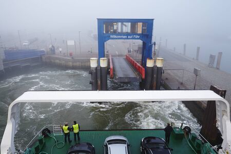 The ferry dock in the port of Wyk of Foehr (Germany, Schleswig Holstein, North Frisia) photographed on the foggy morning of October 3, 2015.