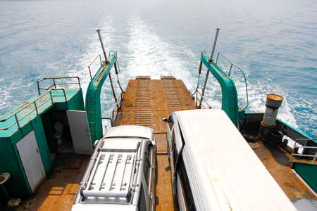 View from behind the car Cars in traffic jam on ferry, sea crossing by ferry