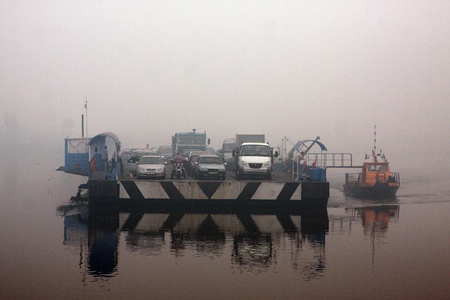07 of August 2010. The Oka river in the smoke in Moscower region. Ferry is mooring