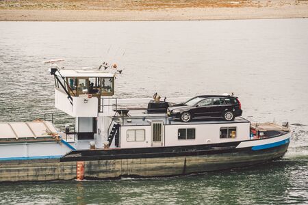 Bottom view of the ro-ro type of ferry that operates on a river for cars transportation to another bank