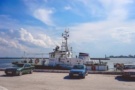 KERCH, CRIMEA, RUSSIA - JUNE 26: Cars and passengers on the ferry in the port of Crimea on June 26, 2015 in Kerch, Crimea, Russia