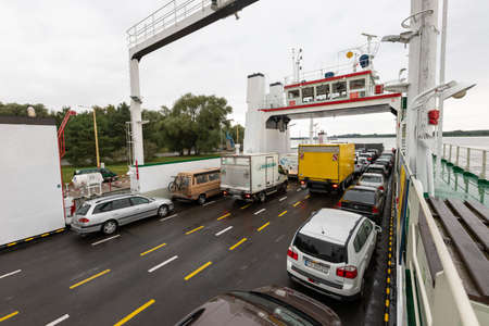 Swinoujscie, Zachodniopomorskie / Poland - August, 28, 2020: Ferry crossing the Swina River. Car ferries that transport cars from one bank to the other. Summer season.