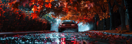A sports car drives through a picturesque autumn scene, with vibrant red and orange leaves reflecting on the wet road, capturing the essence of a dreamy, cinematic moment. Generated A.I.