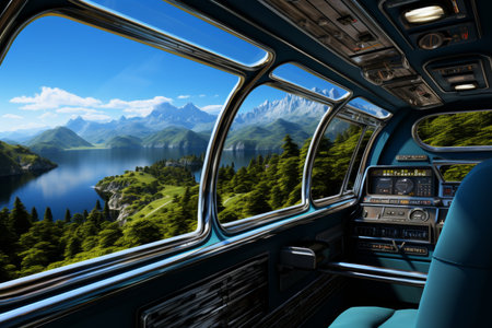 Interior of electric vehicle passenger seat with mountain view, Modern interior of car.