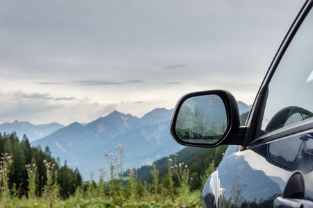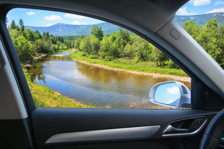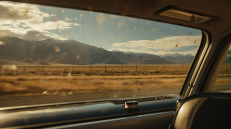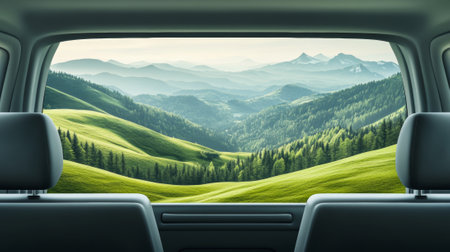 Cheerful mountain view from car window depicting serene landscapes. concept of scenic drives, tranquil journeys, nature appreciation.