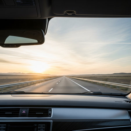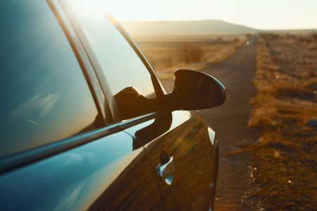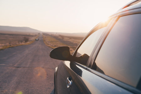 Car interior at sunrise on a forest road. Traveling with car concept. car insurance concept