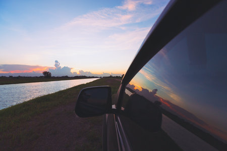 Car parked on lake shore at twilight. Concept of travel, road trip.