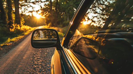 View from inside a car onto a road running through a forest. The sun is setting, creating a warm glow. The steering wheel, side mirror and a bit of asphalt road are visible. High quality photo