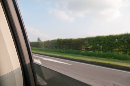 view of the landscape with beautiful clouds from the car window. travel by car to beautiful places and new countries.