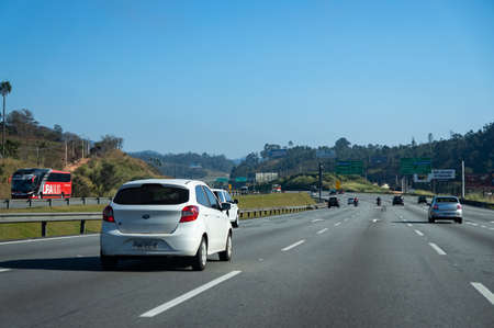JUNDIAI, SAO PAULO / BRAZIL - AUGUST 19, 2018: View of KM 46 of Rodovia dos Bandeirantes highway (official designation SP-348) in early morning, heading north to Cordeiropolis. Jundiai neighborhood.