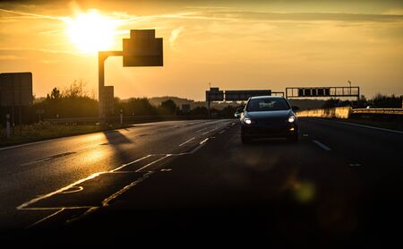 Driving on the Autobahn at sunset in rainy weather