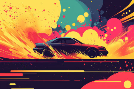 A car is driving down a road with a lot of paint splatters. The car is black and the splatters are red, yellow, and blue. Scene is chaotic and energetic