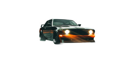A sleek, dark classic sports car emerges dramatically from a hazy, atmospheric background. Its powerful headlights cut through the mist, illuminating its iconic lines and vintage design, creating a mysterious and elegant automotive portrait.