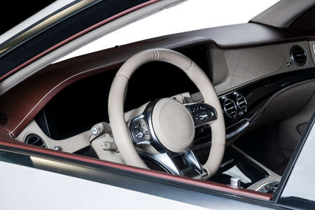Interior view of Modern luxury prestige sport car with leather salon, Steering wheel with car controller system function.