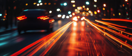 Experience the thrill of speed with this dynamic image of a sports car's glowing red tail lights streaking through a blur of city lights during a nighttime drive.