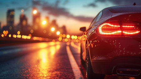 A stylish car's back silhouette glowing with a vibrant crimson glow, set against a vibrant city glow reflected on glistening rain-slick streets at night.