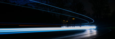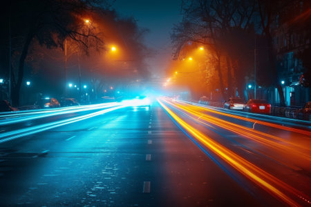 Captivating light trails on a dark road create a striking visual effect, showcasing motion and speed in a nighttime setting. Perfect for artistic projects.