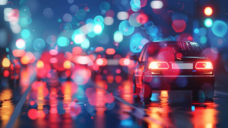 An exotic sports car's bold contours and glaming details are highlighted by the captivating interplay of neon lights, reflections, and blurred city scenery, creating a visually striking automotive