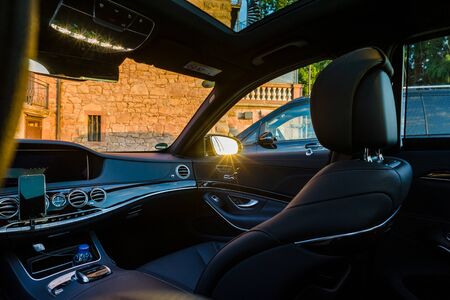 Modern car interior. Interior of prestige modern car. Comfortable leather seats. Modern car interior details. Car detailing.