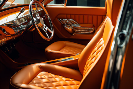 Classic car upholstery with chrome trim and elegant seat detailing, softly lit.