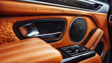 A pair of speakers mounted on the cars rear door surrounded by luxurious leather lining enhances the sound quality of the vehicle