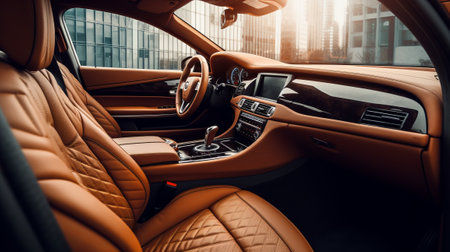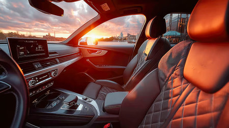 Interior of a luxury car captured at sunset, showing elegant leather seats and a modern dashboard.
