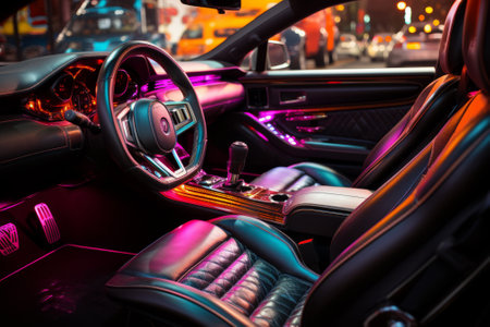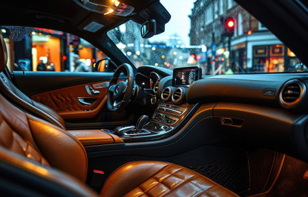 Luxurious car interior with leather seats, dashboard and steering wheel illuminated at night with city lights in the background.
