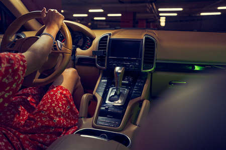 Inside of brand new modern electrical car. Particle view. Cropped photo.