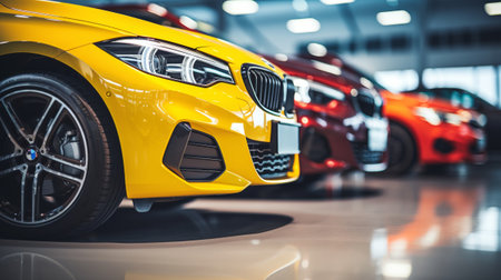 Close-up of row cars in auto store for sale. Automobiles for sale stock lot row in salon, car dealer inventory. Advertisement backgrounds of cars in rows. Used car sales concept. Copy ad text space