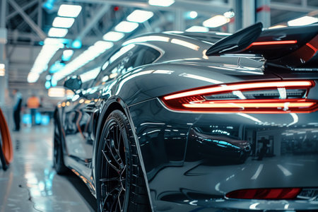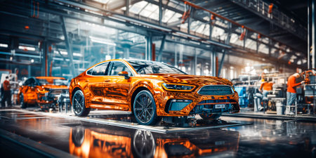 A modern electric car manufacturing plant utilizes advanced technologies, robotics, and automation to produce eco-friendly vehicles. AI Generative