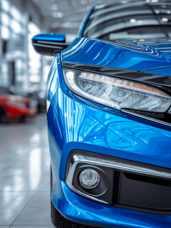 A sleek, vibrant blue vehicle's front view showcases a luminous headlamp and smooth contours, set against a airy, well-lit showroom with polished reflective surfaces