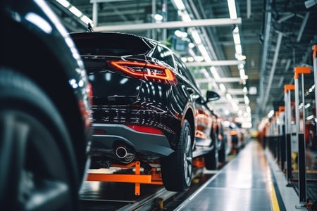Generative AI Vertical photo of automobile production line. Modern car assembly plant. Auto industry. Interior of a high-tech factory, modern production