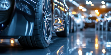 modern car showroom. blurred automobile hoods. not in focus background. copy space