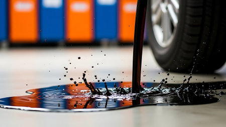 Oil leaking from a vehicle undercarriage in an automotive repair shop during daytime