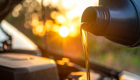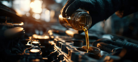 Warm sunset hues illuminate a mechanic's hand as glossy oil flows seamlessly into a vehicle's heart, hinting at care and mechanical precision.