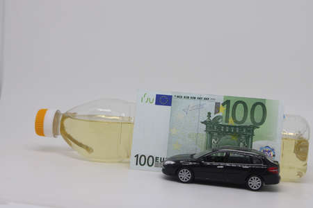 A bottle of vegetable oil and a typewriter lie on a banknote. Biodiesel, biofuel, vegetable oil, fuel crisis, rising fuel prices, biofuel shortage