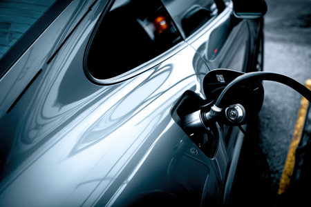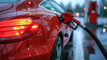 Close-up of a car being refueled at a gas station on a rainy day. The background is blurred, focusing on the fuel nozzle. Concept of transportation.