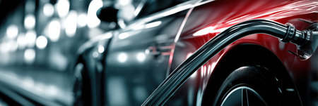 Close-up of a fuel line attached to a sports car, displaying intricate details against a sleek finish while ambient city lights blink softly in the background.