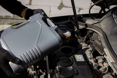 Pouring fresh engine oil from plastic container into car engine high quality image