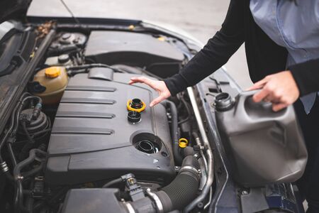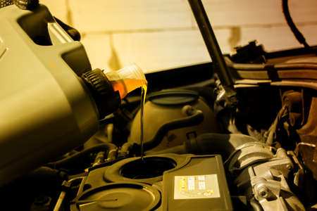 Refueling and pouring oil quality into the engine motor car Transmission and Maintenance Gear .Energy fuel concept. selective focus