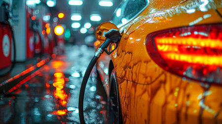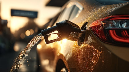 Fuel nozzle pumping gasoline into a wet car tank at a gas station during sunset, with glistening water drops adorning the vehicle's surface, creating a captivating scene