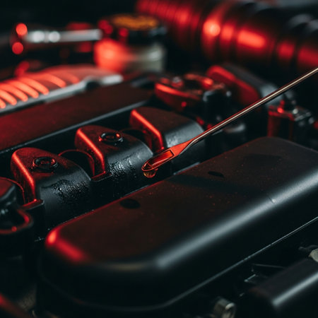 Macro Shot of Gloved Hand Pouring Oil into Car Engine with Cinematic Lighting