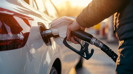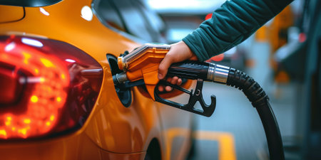 A close-up view of a fuel pump nozzle inserted into a car's gas tank. This image captures the process of refueling with gasoline at a gas station, emphasizing modern transportation and consumer behavior.