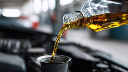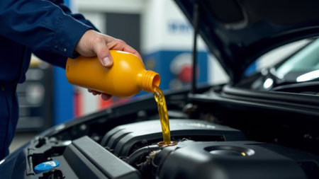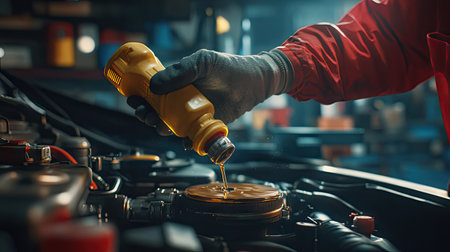 Mechanic pouring motor oil into a car engine, realistic photography style, workshop background, concept of vehicle maintenance service