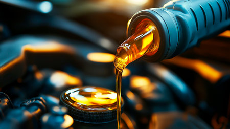 Pouring Oil into Engine for Maintenance. A bottle of motor oil is being poured into a car engine, emphasizing the importance of vehicle maintenance..
