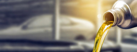 Engine oil flowing from a canister. Golden liquid promise of smooth machinery function. Panorama with copy space..