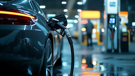 Red fuel nozzle inserted in car tank, refueling vehicle at gas station at night, symbolizing road trip, transportation, energy consumption, and automotive industry