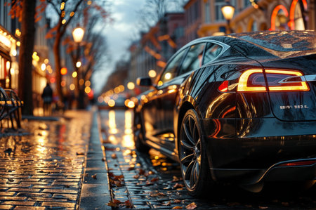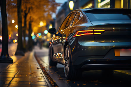 Sports car in the parking lot in the autumn evening park. Electric car with tail light on close-up, car with economical charging.